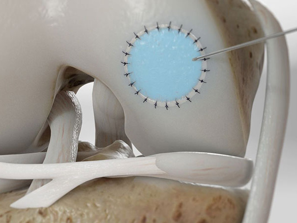 Cartilage replacement is conducted by mixing donated cartilage and fibrin glue and formed into a patch of the appropriate size which is then inserted with a small surgery into the damaged area.
